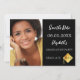 Uma foto Salve o cartão de data de uma festa de formatura. Na frente: adicione sua própria foto vertical do formando. Um fundo preto chic, texto branco. Modelos para um nome e data. O nome e o texto: Salvar a Data são escritos com um script de estilo moderno com letra manual. Com um abstrato moderno boné de ouro falso, tassel topper. Voltar: detalhes da festa.