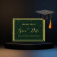 A Save the Date card for a Festa de formatura party. Um fundo verde esmeralda decorado com confete de ouro e uma falso estrutura dourada. Personalize e adicione uma data e um nome. Letras coloridas com ouro. O texto: Salvar a Data é gravado com um script de estilo com letra de tendência grande.