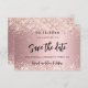 A Save the Date card for a Sweet 16, 16 (ou qualquer idade) festa de aniversário. Um fundo metálico cor-de-rosa pincelado decorado com rosa dourado falso poeira brilhante. Personalize e adicione uma data e nome/idade. O texto: Salvar a Data é gravado com um script de estilo com letra de tendência grande com alternâncias.