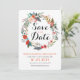 Este convite é na moda e moderno, com uma coroa floral gráfica colorida em torno das palavras salvar a data. Personalize com seus nomes, data de casamento e outras informações como o destino ou um site de casamento. As costas têm um spray de flores que combina com a frente.