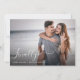 Uma elegante e moderna salva o cartão de anúncio de data, Este design apresenta sua foto de noivado favorita sobreposta com "finalmente" em uma elegante letra branca de cartaz de caligrafia moderna e sua data e local de casamento. Além disso, adicione sua data de casamento no final do cartão.