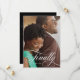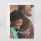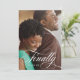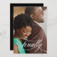 Um elegante cartão de anúncio de salva data, que apresenta sua foto de noivado favorita sobreposta com "Finalmente" em fonte de letra cursiva branca elegante e a data do seu casamento. O verso é preto sólido com os detalhes do seu casamento em preto.