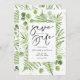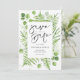 Anuncie sua data de casamento com este verde. Guarde a data do plano. Apresenta ilustração aquarela de furos e quadro de eucalipto e escrita manuscrita. Personalize mudando nomes, casamento, data, local de casamento e outros detalhes. A aquarela salva o anúncio da data será perfeita para o tema do casamento verde e as estações de primavera e de verão. Disponível como cartão postal, cartão plano e cartão magnético.