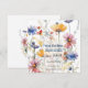 Flores silvestres exuberantes e pintadas à mão em aquarela cobrem seu convite casual "Save the Date". As flores com tons de outono apresentam margaridas laranja terracota com centro amarelo e flores em belos tons de azul e amarelo, unidas por vermelho e verde, juntamente com cinzas e dourados suaves. O texto está em fontes contrastantes em azul e preto de tom de ganga escura. Embora as belas flores silvestres sejam abundantes, seu convite é muito legível porque aplicamos camadas translúcidas que permitem que os aspectos florais espreitem enquanto garantem que o texto seja facilmente lido. É simples substituir os detalhes do seu evento por nossos espaços reservados. Clique no link "personalizar" para criar um lindo anúncio para suas emocionais notícias românticas.