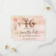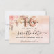 Uma garota e moda Salve o cartão de data para uma doce festa de aniversário 16, 16. Um fundo cor-de-rosa pincelado, rosa de gradiente dourado decorado com florais cor-de-rosa pincelado e grama pampas. Personalize e adicione uma data e nome/idade. O texto: Salvar a Data é gravado com um script de estilo com letra de tendência grande. O número 16 é escrito com um script de estilo de balão.