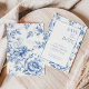 Este refinado cartão de "Salvar a Data", azul e branco, mostra uma elegante borda floral inspirada em toile e um centro nítido e minimalista para seus detalhes de casamento. Uma tipografia belamente equilibrada emparelha uma escrita graciosa com a letra serif clássica para um eterno, romântico. Totalmente personalizável com sua foto, nomes, data de casamento, local e site, esta design é perfeita para apresentar sua celebração com estilo. Uma escolha ideal para casamentos tradicionais, jardins ou costeiros, criando a primeira impressão perfeita para o seu dia especial.