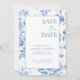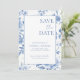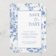 Este refinado cartão azul e branco "Salve a Data" mostra uma elegante borda floral inspirada em toile e um centro nítido e minimalista para os detalhes do seu casamento. Uma tipografia belamente equilibrada emparelha uma escrita graciosa com a letra serif clássica para um eterno, romântico. Totalmente personalizável com seus nomes, data de casamento, local e site, esta design é perfeita para apresentar sua celebração com estilo. Uma escolha ideal para casamentos tradicionais, jardins ou costeiros, criando a primeira impressão perfeita para o seu dia especial.