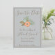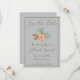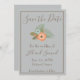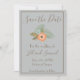 Um cartão de alta classe, salvo a data, é ilustrado com um belo fundo azul. Utilizando um esquema de cores azul e marrom, essa data salva um quadro marrom e um texto marrom. "Salvar a Data" está escrito no topo com uma bela fonte cursiva marrom. Embaixo está um pêssego e um gráfico floral azul. Abaixo estão modelos para inserir informações sobre o casamento. Personalize seus Cartões salve a data hoje mesmo!