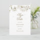 Uma flor branca bonito elegante salve o cartão de data que contém um primavera delicado florescimento enquadrando seus detalhes especiais de data em uma elegante inscrição dourada. Personalize com seus detalhes de eventos especiais. Os traços inversos dispersaram pétalas brancas e florescentes. Projetado por Thisnotme©