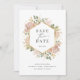 Esse casamento impressionante, que salva os cartões de data, apresenta uma falso estrutura geométrica dourada cercada por flores esmagadas, neutras em aquarelas, cores de tons de terra como pêssego bege, rosa empoeirado e verde macio com sotaque e folhas douradas. Um elegante olhar floral de vassoura sobre um simples fundo branco. A parte traseira do cartão contém duas das suas fotos pessoais e espaço para mais texto ou detalhes.