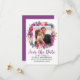 Um belo e colorido quadro de primavera e flores de verão mostra sua foto de casal. O esmagador quadro floral contém flores roxas, vermelhas, rosa e azuis. Salve a data está escrita em um roxo vibrante e profundo para coordenar com as flores. A parte traseira da placa Salvar Data também é roxa.