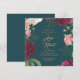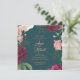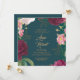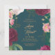 Você está planejando um casamento romântico, rústico, no campo ou num celeiro? O fundo verde esmeralda destaca seus detalhes em dourado e flores em vermelho e rosa. A folhagem floral em aquarela com flores brancas dá aos seus convites de casamento um brilho especial
