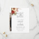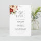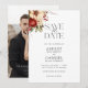 Este Natal romântico e clássico ou com tema de inverno salve a data design apresenta um aglomerado de flores vibrantes vermelhas e brancas de inverno, pínus, bagas ocas e galhos rústicos, gráficos de texto modernos personalizados e campos de texto editáveis. A parte traseira apresenta um modelo de foto e campos de texto.