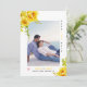 Flores amarelas a aquarela, folhas verdes e foto Salve o anúncio da foto de Data. Uma design adorável que mostra uma foto, flores amarelas do cacto e folhas suculentas nos cantos superior esquerdo e inferior direito, o texto "Salvar a Data" em preto e amarelo e um coração cor-de-rosa pincelado. O verso inclui um padrão de bolinhas em amarelo e branco.