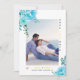 Flores azuis aqua, verde deixa amarela foto Salve o anúncio da foto de Data. Uma design adorável que mostra uma foto, flores azuis aqua nos cantos superior esquerdo e inferior direito, o texto "Salvar a Data" em preto e amarelo e um coração cor-de-rosa pincelado. O verso inclui um padrão de bolinhas em amarelo e branco.