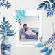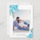 Flores azuis aqua, folhas verdes e foto Salve o anúncio da foto de Data. Uma design adorável que mostra uma foto, flores azuis aqua nos cantos superior esquerdo e inferior direito, o texto "Salvar a Data" em preto e azul e um coração cor-de-rosa pincelado. O verso inclui um padrão de bolinhas em azul e branco.