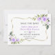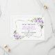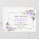 Desenho de cartão elegante com flores de lavanda aquarela e folhas verdes, uma moldura dourada falsa, divisor floral, em um fundo branco. No verso, coroa floral de lavanda em forma de coração e iniciais. Use a ferramenta Personalizar para adicionar suas informações, alterar fontes e cores das fontes. Para itens correspondentes, visite minha Coleção de Flores de Lavanda.