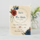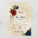 Único guarde o cartão de data com laranja romântico queimado e flores azuis marinhos e folhas verdes. PARA MAIS PRODUTOS CORRESPONDENTES, clique na coleção acima ou entre em contato comigo.