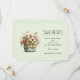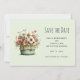Cartão de salvar a data com um vaso de flores estiloso e caprichoso. Cores verde, rosa e creme. Conjunto em um vaso verde com um pano xadrez. Atmosfera vintage desgastada.