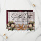 Este design tem uma elegância rústica, mantendo um tema simples. Fundo de madeira de celeiro com fita bordô, renda, ferraduras amarradas e buquês de flores silvestres com espaços reservados para a data na frente. Espaço reservado para uma foto do casal está no verso do cartão com nomes e a escrita "Gettin' Hitched" em um fundo de fita correspondente. Projetado para combinar com a coleção "Gettin' Hitched - Horseshoes, Ribbon & Lace". Para alterar os detalhes, clique em «Personalizar». Para mover o texto ou alterar o tamanho, a fonte ou a cor do texto, clique em «Clique para personalizar ainda mais»