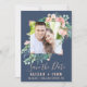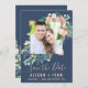 Este romântico floresce a foto azul, salvo o cartão de encontro é perfeito para um casamento elegante. O design floral apresenta flores cor-de-rosa pincel, pêssego e aquarela branca com elementos geométricos falsos de rosa de ouro sobre fundo azul marinho. Personalize o cartão com a sua imagem de noivado favorita, nomes, data de casamento e localização. Nota: Este design não apresenta folha de ouro rosa real. É um gráfico de alta qualidade feito para se parecer com um martelo de ouro rosa.