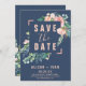 Este romântico floresce azul, salvo o cartão de data é perfeito para um casamento elegante. O design floral apresenta flores cor-de-rosa pincel, pêssego e aquarela branca com elementos geométricos falsos de rosa de ouro sobre fundo azul marinho. Nota: Este design não apresenta folha de ouro rosa real. É um gráfico de alta qualidade feito para se parecer com um martelo de ouro rosa.