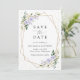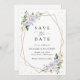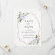 Convide amigos e família de estilo e defina o tom para seu dia especial com este charmoso cartão de data. Design apresenta flores roxas e brancas de aquarela, verde, confete dourado e moldura dourada sobre fundo branco.
