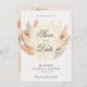 Esta macia e terraplenada é uma mistura equilibrada de charme rústico e delicada elegância, com lindas flores secas a aquarela e grama-pampas em tons de bege quente e rosa poeirento. A expressão "salvar a data" é escrita num texto elegante e castanho. Abaixo dos nomes, da data e da localização do casamento em uma fonte sérvia de todos os bonés. Adicione uma de suas fotos de noivado favoritas à parte traseira do cartão enquadrado por um arco floral romântico