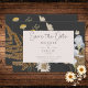 Anuncie seu casamento com um toque de elegância rústica. A nossa cativar, exceto o cartão de data, apresenta um arranjo vibrante de flores silvestres e samambaias, meticulosamente desenhado à mão e reminiscente de tesouros botânicos prensados. Cores ricas como bronzeado, amarelo, creme, azul e verde sábio se destacam lindamente contra uma impressionante estrutura de fundo preto de carvão. Os detalhes do seu casamento são mostrados em uma caixa de texto de creme nítida, garantindo clareza e elegância. Este design captivador captura a essência de um campo de flores silvestres, oferecendo uma maneira única e memorável de celebrar sua história de amor. Criado pela imprensa simplesmente de farmácia.
