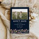 Flores Selvagens Salvem A Data com Cartão Plano Fotográfico. Este na moda e elegante salve a data do convite contém lindíssima cor d'água pintada manualmente Flores selvagens. Localize itens correspondentes na Coleção de Sonhos Azuis de Flores Selvagens Marinhos.