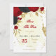 Flores românticas vermelhas escuras e negras com folhas de ouro botânicas exceto a data de convite Os detalhes de brilho são simulados.