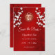 Cereja branca floresce e um símbolo de felicidade dupla dourada num fundo floral vermelho brilhante. Salve o texto da data em uma fonte elegante. Produtos de casamento chineses correspondentes disponíveis.
