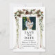 Elegante Casamento Canopy Watercolor Verde Castanho Floral Noivado Anúncio Salve O Cartão de Data inclui lindas rosas brancas e flores marrons. O arco da copa do casamento da madeira inclui vegetação botânica. Adicionar Foto do Casal.