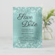Folha de turquesa pálida e folha de papel pastel aqua ombre para o seu casamento, exceto a informação de data. A fonte decorativa "Salvar a Data" é um estilo elegante de caligrafia contemporânea. As informações de nome e evento são exibidas em um estilo de fonte mais clássico. Casamento de gradiente de brilho salva a data. Diminuição falsa das datas.