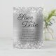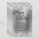 O brilho de prata falso e a folha de cinza de prata para o seu casamento, salvem a informação de data. A fonte decorativa "Salvar a Data" é um estilo elegante de caligrafia contemporânea. As informações de nome e evento são exibidas em um estilo de fonte mais clássico. Casamento de gradiente de brilho salva a data. Literalmente, guarde as datas.