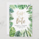 Cartões salve a data de folhagem modernas de palmeiras tropicais. Texto do script de efeito ouro pintado à mão. Parte de uma coleção de tendência de verão. A cor de fundo pode ser alterada.