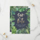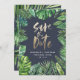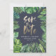 Cartões salve a data de folhagem modernas de palmeiras tropicais. Texto do script de efeito ouro pintado à mão. Parte de uma coleção de tendência de verão. A cor de fundo pode ser alterada.