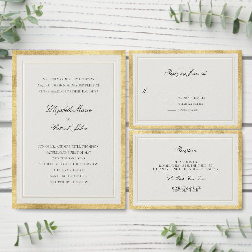 Announce your wedding with timeless sophistication using this Elevated Faux Gold Wedding Save the Date, featuring a beautifully refined double frame that adds graceful structure and depth. Designed on a soft, ecru background with a delicate watercolor paper texture, this piece evokes classic elegance and understated luxury.