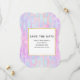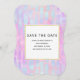 Festa de aniversário salve a placa de data com um padrão de fundo abstrato. As aquarelas roxas e azuis cor-de-rosa formam este design artístico que apresenta formas retangulares verticais sobre um fundo malhado. Um quadrado em camadas acima com uma borda falsa de folha de ouro, seu dentro de texto personalizado.