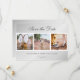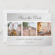 Elegante cartões salve a data de fotos de casamento prateado apresentando uma colagem de fotos de noivado e uma letra de roteiro em um fundo prateado. Casamento de prata personalizado salve os cartões de data. Casamento de prata personalizável salve os cartões de data. Casamento de script salve os cartões de data. Cartões salve a data personalizados de colagem de fotos.