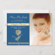 Flor de rosa de ouro elegante, única, em combinação com fundo azul clássico de tendência e folha de trás dourada. Glamorosa, luxuosa Salve o convite da data, com foto personalizada.