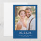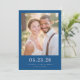 Este convite de casamento apresenta uma fotografia central de dois indivíduos, emoldurada por uma borda azul-marinho sólida. Os tons quentes na foto, incluindo tons de pele suaves e verdes terrosos do fundo desfocado, contrastam lindamente com o azul-marinho frio. O design usa tipografia serifada em negrito para a data e os nomes, criando um visual elegante, mas casual. O clima geral é alegre e antecipatório, capturando um momento espontâneo que enfatiza a autenticidade e o calor. Perfeito para casais que desejam definir o tom do seu dia especial com um toque de elegância natural.