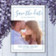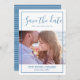 Frame moderno Salve o Anúncio de data com um design de borda simples e clássico em azul. As listras finas adoram o verso deste anúncio. Adicione uma foto e detalhes do casamento para personalizar. A cor de fundo no verso do convite pode ser alterada para complementar a foto ou para adicionar uma cor de casamento.