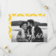 Foto de na moda, salve a data da placa plana com caligrafia branca, com letra branca, com o padrão amarelo de diamantes de ikat. Você pode personalizar a foto, os textos e o padrão posterior. Uma versão do cartão postal também está disponível.