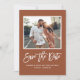 Anuncie sua data de casamento para a família e amigos com este cartão personalizável, salve a data do anúncio. Ele apresenta uma caligrafia ousada e uma simples tipografia. Personalize este terracota para salvar o cartão de data, adicionando sua própria foto e detalhes do casamento. Esta foto para salvar o cartão de data também está disponível em outras cores.