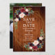 Elegante Watercolor Burgundy Floral Save O Cartão de Anúncio de Casamento de Data inclui rosas burgueses, flores azuis, rosas cor-de-rosa, flores vermelhas e verde numa moldura geométrica dourada. Madeira russa do campo. Foto de volta.