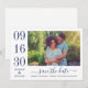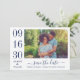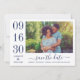 Casamento moderno e na moda guarde os cartões de anúncio de data e apresente uma foto horizontal de noivado com um design tipográfico que inclui números ousados e elegantes de datas de casamento com um simples monograma dos nomes da noiva e do noivo. esquema de cores azul e branco do marinho.