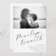 Esta foto de casamento contemporânea salva a data com uma composição horizontal minimalista e os nomes da noiva e noiva em uma caligrafia de na moda em preto sobre fundo branco.