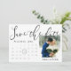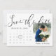 Elegante Script Classy Back White Wedding Foto Salvar a Data. Simples mas elegante Guarde o Cartão de Data. A frente do cartão tem um calendário para marcar a data do casamento e os nomes da noiva, noiva e espaço para a foto do casal. A parte traseira do cartão tem fundo preto com outros detalhes do casamento junto com o endereço de retorno. O Cartão pode ser personalizado movendo o pequeno quadrado sobre os números para selecionar a data do casamento. Para mais personalizações, contacte-me em mypaperlove2021@gmail.com