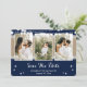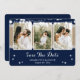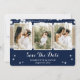 Casamento de marinho azul-rústico country com foto, salve o cartão de data com uma colagem fotográfica com as luzes de cordas contra uma toca e fundo do local.